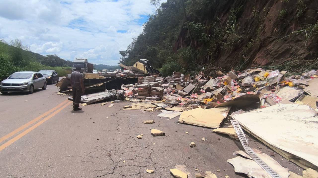 Um caminhão carregado com frangos congelados se envolveu em um acidente na manhã desta quarta-feira (11) na Serra da Santa, trecho da BR-356, em Itabirito. Segundo informações do Corpo de Bombeiros Militar de Minas Gerais, o veículo teria perdido os freios enquanto descia a serra e acabou colidindo contra uma encosta às margens da rodovia. Com o impacto, o caminhão ficou atravessado na pista, o que provocou a interdição total das duas faixas da estrada e gerou transtornos para motoristas que trafegam pela região. Apesar do susto, o motorista não sofreu ferimentos e optou por dispensar atendimento médico no local. A ocorrência ainda está em andamento. Equipes aguardam a transferência da carga para outro caminhão, procedimento necessário para que o veículo acidentado seja retirado da pista e o tráfego possa ser normalizado. Motoristas que passam pelo trecho devem redobrar a atenção e, se possível, buscar rotas alternativas até a liberação completa da via.